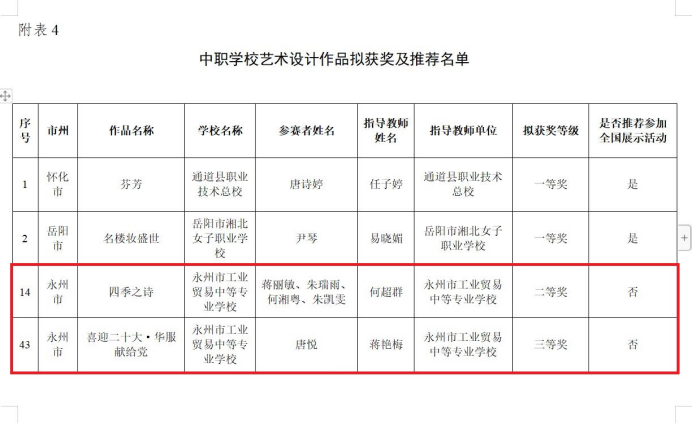 沈曾艳老师、高敏老师指导的作品《红色精神,代代相传》,杨婷婷老师、黄华老师指导的作品《汉字的演变史》均获“中职学校非遗技艺技能展示作品”省二等奖;何超群老师指导的作品《四季之诗》、蒋艳梅老师指导的作品《喜迎二十大·华服献给党》分别获得“中职学校艺术设计作品”省二等奖、省三等奖。大赛由湖南省教育厅、湖南省文化和旅游厅举办,参赛作品经过前期各地各校申报、专家评审等环节后最终确定,部分优秀获奖作品、优秀案例将推荐参加全国展示活动。
