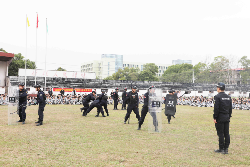 随后,道县公安局巡特警大队战狼突击队的队员们在该校田径场开展了应急处突现场演练。所有参加本次活动的同学一同进行了“我守法,我光荣”现场签名活动。